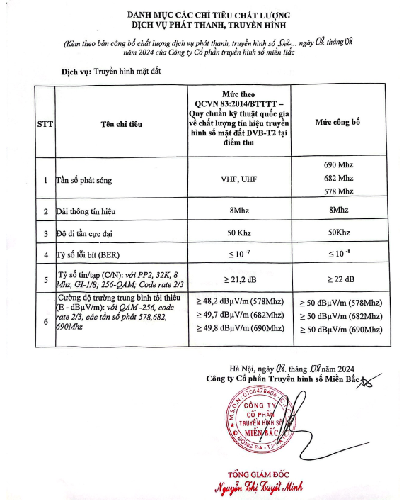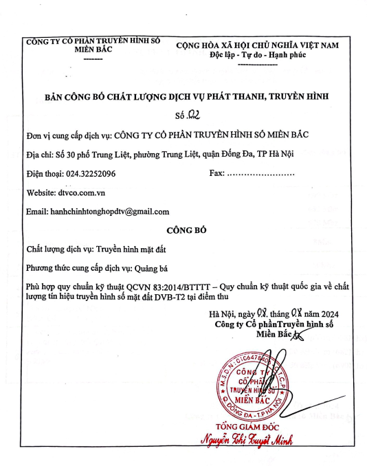 Bản công bố chất lượng dịch vụ phát thanh, truyền hình Công ty Cổ phần Truyền hình số Miền Bắc